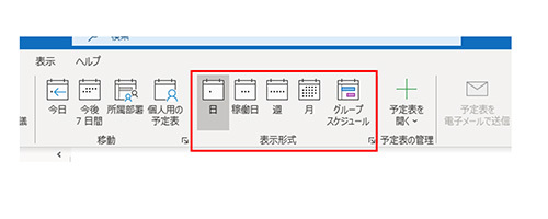 自身のスケジュールを閲覧する場合、縦型のスケジュールで表示される。上から下にスクロールして確認しよう。表示形式から「日」を選ぶと、当日もしくは指定した1日のみスケジュールが閲覧できる。「稼働日」は、1週間の中で稼働する日のみの予定表が閲覧できる。一般的には月~金の5日間が稼働日で、土日が休みという場合が多い。