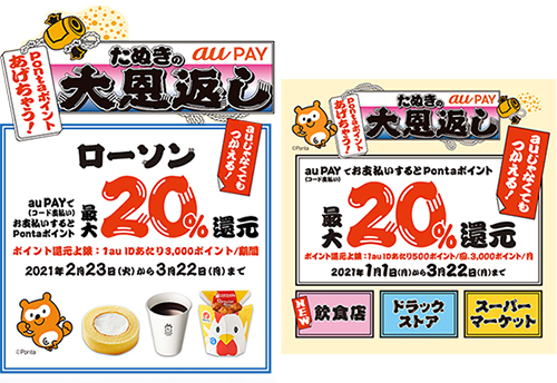 「たぬきの恩返し」キャンペーンの注意点は終了日が月末ではなく、3月22日ということだ。先述した超PayPay祭は3月28日までなので(特定店舗のキャンペーンは28日より前に終了するものもあり)、フルに使い切りたいならau PAYのキャンペーンを先に消化するのも手だろう。