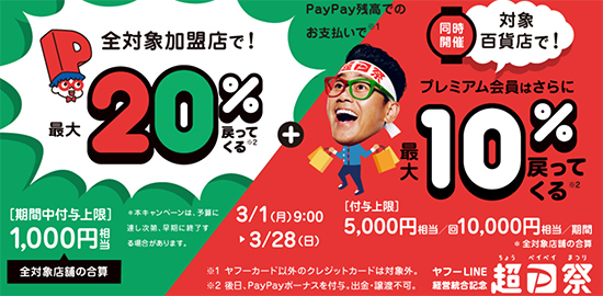 買い物がさらにお得になる特典も見逃せない。常に開催されているものでは、Yahoo!ショッピング・LOHACO・PayPayモールで毎日の買い物でPayPayボーナスが2%追加されるキャンペーンなどがある。また、3月1日に開始した「超PayPay祭」でも会員限定で還元率がアップする仕掛けがある。