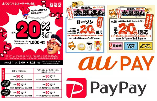 まず最も優先すべきはPayPayが3月28日まで実施している「超PayPay祭」で、次に押さえておきたいのがau PAYの「たぬきの恩返し」キャンペーン。また、各社が注力している地域限定キャンペーンもインパクトが大きい。還元率や使える店舗の数などで使いやすさも高いので、実施地域が生活圏の人はそちらを優先するのもありだ。