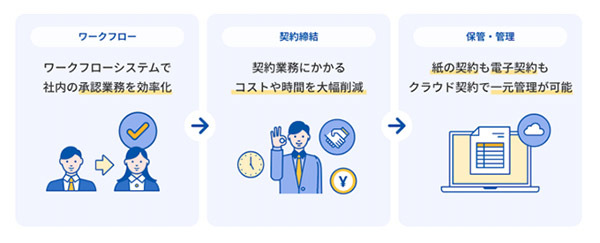マネーフォワード クラウド契約は、契約のワークフロー申請から契約締結・保管をクラウド管理できる電子契約サービス。紙の契約書を発行する際に必要な印刷・製本・押印・郵送などの手間や時間、コストを削減できる。これにより、紙の契約と電子契約の一元管理が可能となり、契約管理の業務効率化を実現する。