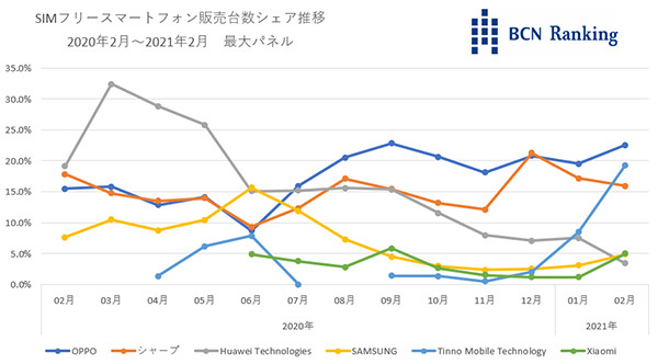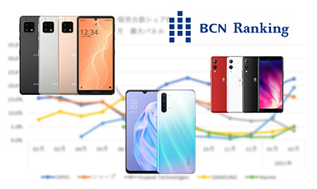 全国の主要家電量販店やECショップからPOSデータを集計する「BCNランキング」によると、2021年2月のSIMフリースマートフォン(スマホ)の販売台数前年同月比は184.7%だった。前月も132.9%と好調だったが、新生活需要も取り込んで、さらに上昇幅を広げている。