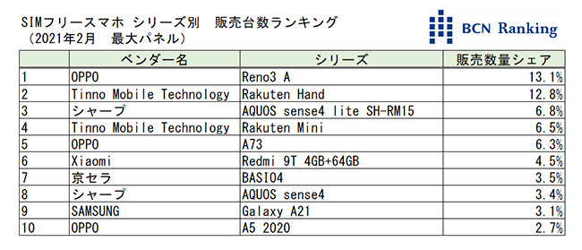 シリーズ別の販売台数ランキングでは、OPPOの「OPPO Reno3 A」がトップを維持しているが、以下は入れ替わりが激しい。Tinno Mobile Technology(楽天モバイル)のRakuten Handが2位、Rakuten Miniが4位に急上昇。さらに、シャープの発売間もない「AQUOS sense4 lite SH-RM15」が3位に入るなど、大混戦の様相だ。(BCN・大蔵 大輔)