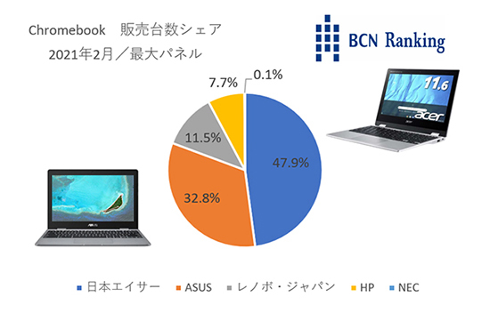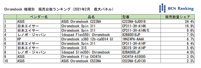 21年2月のメーカー別シェアでは、47.9%で日本エイサーがトップ。次いで、32.8%のASUS、11.5%のレノボが続く。一方、機種別で最も売れているのはASUSの「ASUS Chromebook C223NA」。18年10月発売のモデルながらコスパの良さで24.4%のシェアを占めている。