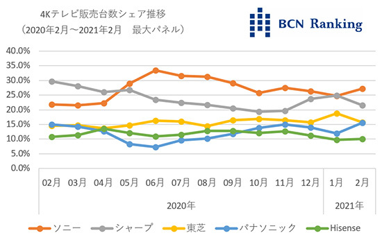 全国の家電量販店やECショップでPOSデータを集計する「BCNランキング」によると、2021年2月の4K対応液晶テレビ(4Kテレビ、なお有機ELテレビは含まない)の販売台数前年同月比は106.5%だった。昨年は、新型コロナウイルス感染拡大による巣ごもり需要で年間を通してテレビ市場が活況だったが、年が明けて特需がだいぶ落ちつきつつある。