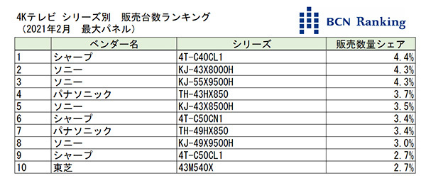 シリーズ別の販売台数ランキングでは、シャープの「4T-C40CL1」がトップ。0.1ポイント差でソニーの「KJ-43X8000H」「KJ-55X9500H」が追う展開。昨年は不調だったパナソニックも4位に「TH-43HX850」、7位に「TH-49HX850」がランクインするなど復調の兆しがある。(BCN・大蔵大輔)