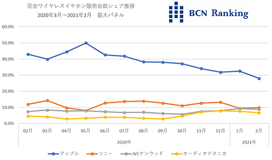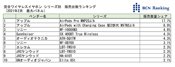 全国の家電量販店やECショップでPOSデータを集計する「BCNランキング」によると、2021年2月の完全ワイヤレスイヤホンの販売台数前年同月比は99.2%だった。「BCNランキング」の集計開始以来、常に前年比を超えていたが、初めて前年を下回った。これは、市場が縮小しているのではなく、成熟期に差し掛かっているという見方ができそうだ。