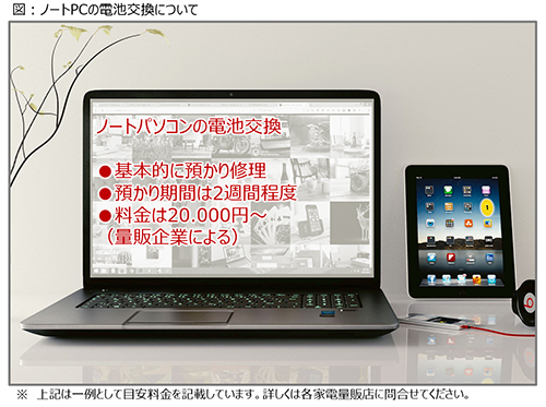 ここで気になるのが、バッテリーが消耗し、充電できなくなった場合だが、ノートPCのバッテリー交換は基本的に預かり修理になる。こちらも、最新の料金体系を確認するため、某家電量販店に問い合せてみたことろ、