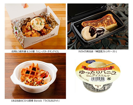 取り扱い店舗とメニューは、「台湾もつ鍋本舗 もつ小屋」で「ハニーバターチキンアイス」(税込み価格は750円)、「かざみどり南池袋」で「韓国風フレンチトースト(1日10個限定)」(テイクアウトが同540円、店内飲食が同550円)、「とある池袋のビストロ酒場 Bisrock」で「ワッフルカルテット」(同680円、デリバリーが880円)となる。