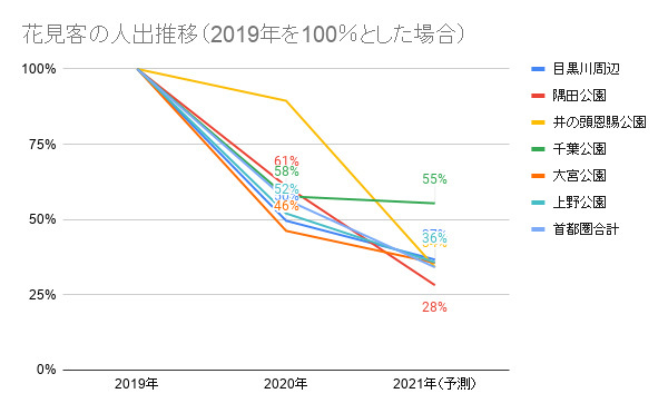予測によれば、19年におけるピークだった土日の人出に比べて21年3月27~28日は34%(66%減)と3分の1程度、20年の半分強になるという。エリアでは、隅田公園が19年と比較して72%減と、多くが人出が減るとのことだ。
