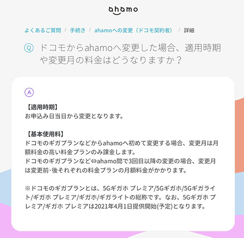 ドコモ回線契約者向けに二つ、重要と思われる質問と回答を紹介しよう。ドコモ回線からahamo回線に変更する場合、申込当日から適用になり、ahamoに初めて変更する場合、変更月は、ahamoの月額料金2970円(税込)を基準に、より高いプランの月額料金が請求される。ただし、ドコモ・ahamo間で3回目以降の変更の場合は、変更月は両方の月額料金が請求される。ドコモ継続利用年数はドコモ・ahamoを問わず通算してカウントするため、こうした措置になったようだ。
