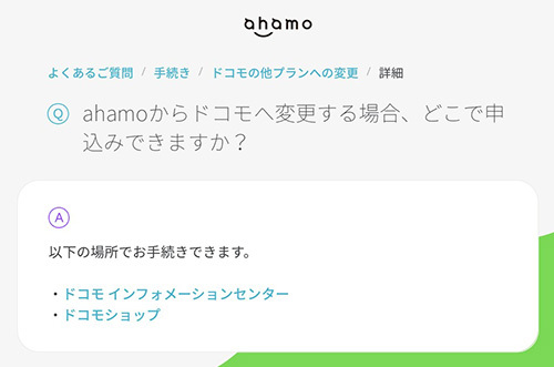 また、「よくある質問」から、ドコモ・ahamo間の移行手続きはドコモショップ、ドコモ インフォメーションセンターで受け付けると判明した。今後、変更になる可能性はあるが、当初はオンライン手続きは不可となる。