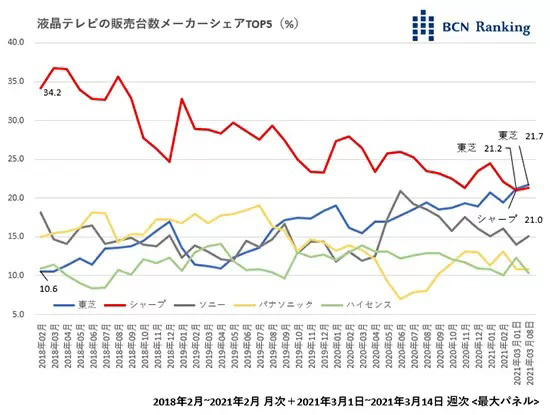 この3年の動きを月次シェアで振り返ると、シャープは下落トレンドが続いていた。18年に3割前後を維持していたが、19年2月以降3割を切り始め、昨年8月以降は25%を下回って推移している。一方、1割程度で低迷していた東芝は19年8月以降15%を安定的に上回るまでに販売を拡大。この1月は20.8%と、初めて2割を突破した。3月に入った週次シェアでは、第1週に続き、第2週(3月15~21日)も21.7%とトップシェア維持している。