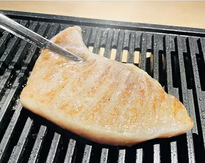 提供されているのは、ジューシーな脂が焼きうおにぴったりなマグロのハラモ。ハラモは、大トロの横にある魚体の中でも一番脂がのっている部位で、焼肉カルビのようなジューシーさと旨味が味わえる。その他、ほほ肉、本マグロの血合いなども提供。遠赤外線の焼き台でふわっと香ばしく焼き上げると、噛みしめるたびに魚の旨味が口の中に広がる。