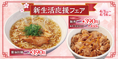 今回の新生活応援フェアでは、「醤油拉麺」(通常490円)を390円、「豚丼」(通常430円)を390円、「豚丼+生玉子セット」(通常490円)を450円、「豚丼ミニ」(通常290円)を270円、「醤油拉麺・ミニ豚丼」を660円、「豚丼・ミニ拉麺」を610円で提供する。