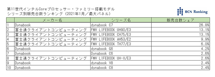全国の家電量販店やネットショップのPOSデータを集計する「BCNランキング」によると、第11世代インテルCoreプロセッサー・ファミリー搭載機はまだ高価格のものが多いなか、2020年秋冬に発売したモデルのうち、21年1月の販売台数比率で12.4%を記録。これは20年12月のおよそ2倍の数字だ。