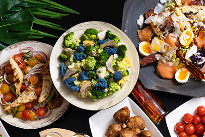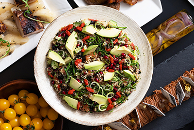 また、キヌア、ブルグル、ワイルドライスなどのスーパーフード満載の「スーパーグレインサラダ」、トマトやキュウリの旨味エキスをたっぷり含んだ「トスカーナサラダ」や「彩りカリフラワーサラダ」など豊富なセレクションでヴィ―ガンの人にも満足できるヴィ―ガン・コーナーを用意する。
