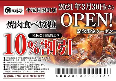 新店舗では、オープン記念として、店舗限定10%割引クーポンを公式ウェブサイトで配信。平塚見附店限定の10%割引クーポンは、2021年5月30日まで利用できる。クーポン画面の提示・印刷どちらでも可能だ。