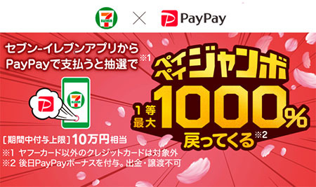PayPayのキャンペーンは、全国のセブン‐イレブン店舗が対象。「セブン‐イレブンアプリ」からPayPayで支払うと、抽選で決済金額の最大1000%を還元する「セブン‐イレブンアプリ当たる!ペイペイジャンボ」に参加することができる。期間は4月27日まで。
