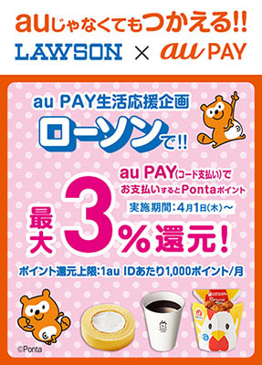 au PAYは、全国のローソン・ナチュラルローソン・ローソンストア100で、Pontaポイントを3%還元する「ローソン生活応援企画」を開催中。ポイント還元上限は、1au IDにつき1カ月1000ポイント。auユーザーだけでなく、全てのユーザーが対象となる。キャンペーン終了時期は未定。