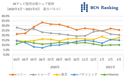 全国の家電量販店やECショップでPOSデータを集計する「BCNランキング」によると、2021年3月の4K対応液晶テレビ(4Kテレビ、なお有機ELテレビは含まない)の販売台数前年同月比は113.0%と、前月の106.5%から6.5ポイント上昇した。巣ごもり需要などを背景に新生活商戦が活況だったことがうかがえる。