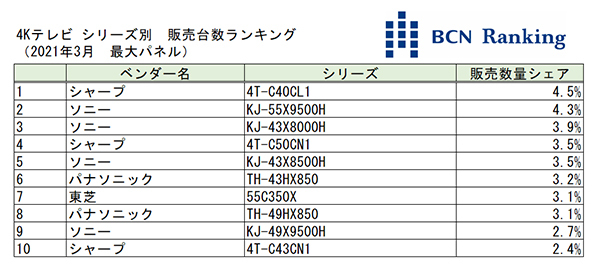 シリーズ別の販売台数ランキングでは、シャープの「4T-C40CL1」がトップをキープ。コスパの良さから支持を集めているようだ。2位がソニーの「KJ-55X9500H」、3位が「KJ-43X8000H」。じわじわとシェアを上げている東芝は、7位に「REGZA 55C350X」がランクインした。(BCN・大蔵大輔)