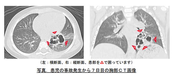 乳幼児は、トイレに置いてあったものを誤飲したようだ。芳香剤の香りがある嘔吐を3回し、激しいせき込みもみられた。その後、40度の発熱や頻呼吸が現れ、翌日、胸部レントゲンで肺炎像と高度炎症反応が認められて入院となった。事故発生から7日目の胸部CTにより、肺の一部が空洞のようになっている箇所がみられた。今回の事象は、誤飲した際、あるいは嘔吐した際に肺に入り込んだ芳香剤の成分による影響を受けたものと考えられるという。