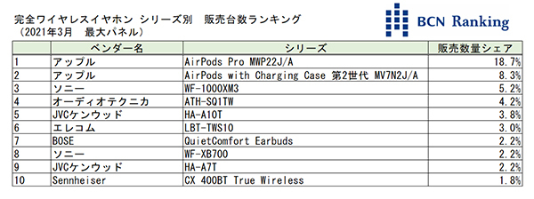 シリーズ別のランキングでは、アップルの「AirPods Pro」(17.7%)、「AirPods with Charging Case 第2世代」(8.9%)、ソニーの「WF-1000XM3」が不動のトップスリーとなっている。続くのはゼンハイザーの「CX 400BT True Wireless」。高級ブランドの同社としてはリーズナブルな価格の製品で人気を集めている。(BCN・大蔵 大輔)