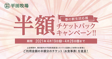 平田牧場は、東京都内の直営レストラン限定で利用金額の半額相当を次回利用できる食事割引券を配布する「春の新生活応援、半額チケットバックキャンペーン」を4月19日から28日までの10日間にわたって実施する。