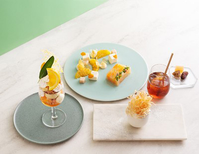 コースは、1皿目に河内晩柑とカラマンダリンを使用した「テリーヌ」で始まり、2皿目にしまなみレモンをヴェリーヌ仕立てで軽やかに仕上げた「タルトシトロン」、3皿目に爽やかな夏みかんソルベとジャスミンミルクジェラートをメインにした「パフェ」となっている。見た目も華やかに、旬の柑橘が楽しめる。