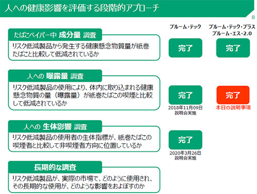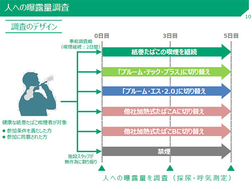 人への研究影響を評価するアプローチは段階的で、「たばこベイパー中の成分量調査」「人への曝露量調査」「人への生体影響調査」「長期的調査」の順で行っている。今回の会見で発表されたのは、2段階目の「人への曝露量調査」についての研究結果だ。