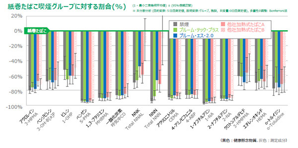調査の結果、明らかになったのは、紙巻たばこから「プルーム・テック・プラス」「プルーム・エス・2.0」を含む4種の加熱式たばこに切り替えたグループでは、測定した健康懸念物質の多くで、曝露量が禁煙したグループと同様のレベルまで低減したということだ。また、紙巻たばこを継続したグループと比較すると、測定した健康懸念物質の多くで曝露量が顕著に減少していた。