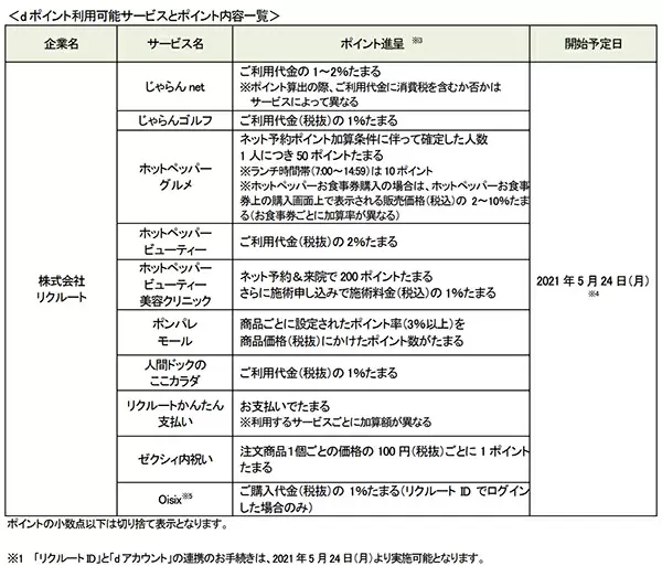 NTTドコモは、2020年1月の業務提携に基づき、ID連携によって共通ポイントサービス「dポイント」がリクルートが運営する対象サービスで5月24日からたまる・使えるようになると発表した。「リクルート ID」と「dアカウント」の連携が条件となり、同日から連携手続きを開始する。
