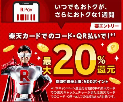 楽天は4月23日10時、「楽天ペイでいつでもおトクが、さらにおトクな1週間!楽天カードでのコード・QR払いで最大20%還元!」を開催する。期間は4月30日9時59分までとしている。
