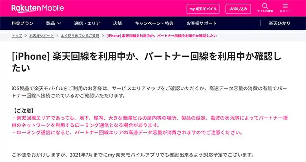 iPhoneに楽天モバイルのSIMをセットしてmy楽天モバイルアプリを起動しても、現在は接続先は表示されないが、「お客様サポート」の回答から、iPhone版でもAndroid版と同様、接続先を確認できるよう、2021年7月までに対応予定と分かった。それまではサービスエリアマップで確認してほしいとしている。