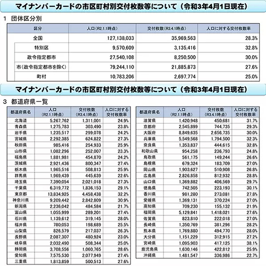 マイナンバーカードの交付状況は、総務省のウェブサイトで知ることができる。全国を含む団体区分別、都道府県別、市町村別、年齢層別に、交付枚数や該当人口に対する交付枚数率を公表している。これによると、令和3(2021)年4月1日時点で、人口に対する交付枚数率は全国で28.3%、東京都に限ると32.2%で、都民はほぼ3人に1人がマイナンバーカードを保有していることになる。