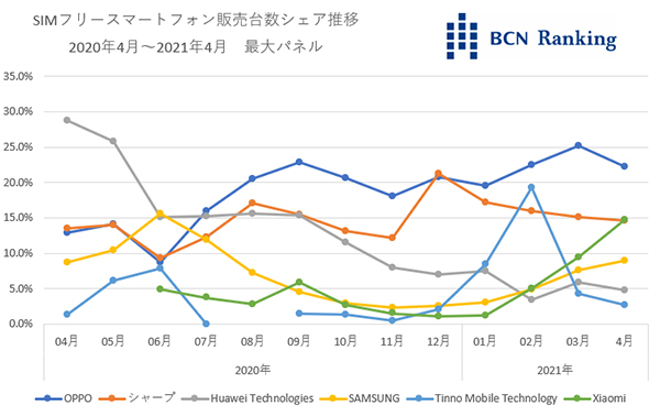 全国の主要家電量販店やECショップからPOSデータを集計する「BCNランキング」によると、2021年4月のSIMフリースマートフォン(スマホ)の販売台数前年同月比は178.0%。前年同月が緊急事態宣言の影響で不調だったことを考慮する必要はあるが、年初から好調を維持している。