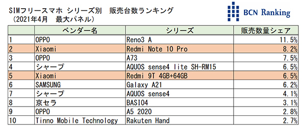 シリーズ別の販売台数ランキングでは、OPPOの「OPPO Reno3 A」がトップを死守。同社はほかにも「OPPO A73」「OPPO A5 2020」などがトップテンにランクインしている。急成長するXiaomiは4月発売の「Redmi Note 10 Pro」が早くも2位に登場。2月発売の「Redmi 9T 4GB+64GB」も5位と堅調だ。(BCN・大蔵 大輔)
