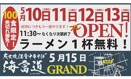 MUGENは5月10~13日、東京・神田の「炭火焼濃厚中華そば海富道(しーふーどう)」で毎日100杯無料キャンペーンを実施している。5月15日のオープンを記念したイベントとなる。