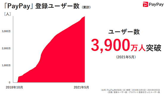 PayPayのユーザー数は、21年5月に3900万人を突破。加盟店数は、コンビニやドラッグストア、スーパー、飲食店など、316万カ所に上る。年間の決済回数は20億回(前年比約2.5倍)を超える。