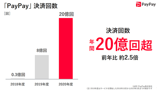 前年よりも2兆円多い、前年比2.6倍になった。サービスを開始した18年度が800億円(18年10月~19年3月)、19年度が1.2兆円だった。決済取扱高とは、PayPayによる決済総額のことで、個人間送金などは含まない。