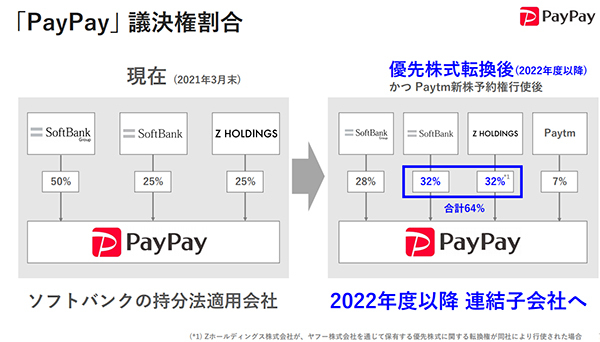 なお、PayPayは現在、ソフトバンクグループが50%、ソフトバンクとZホールディングスがぞれぞれ25%の議決権を持ち、ソフトバンクの持分法適用会社の位置づけだが、22年度以降は優先株式交換により、ソフトバンクグループが28%、ソフトバンクとZホールディングスがそれぞれ32%(合計64%)、Paytmが7%となり、ソフトバンクの連結子会社になる予定だ。