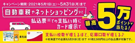 ローソンは、自動車税や公共料金など、収納代行1件2500円以上の支払いの際にPontaカードまたはdポイントカード(Pontaポイント・dポイントがたまるカード全て)を提示すると、抽選で最大5万ポイントが当たる「収納代行キャンペーン」を5月1日に開始した。キャンペーン終了日は5月31日。