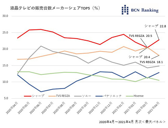 4月の液晶テレビメーカー別販売台数シェアは、シャープが22.8%でトップ、REGZAが18.1%で2位。以下、ソニーが14.8%、パナソニックが12.8%、Hisenceが10.5%で続いた。16年5カ月の間、連続してトップシェアを守ってきたシャープが3月、0.1%の僅差ながらREGZAに破れ、初めて2位に後退。その後の動きに注目が集まっていたが、わずか1カ月でトップの座を取り戻した。