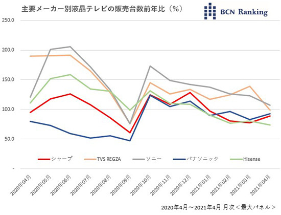 一方、巣籠り特需を取りこぼしたのがシャープとパナソニック。特に、パナソニックは一時前年比で半減水準まで売り上げを落とした。シャープは2桁増を記録する月もあったが、他社に比べて不安定で迫力に欠けていた。2社とも年末商戦では盛り返し2ケタ増まで挽回したものの、今年に入って再び前年比マイナス圏で苦しんでいる。シャープとREGZAの逆転劇は、こうした背景から生まれた。