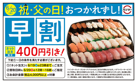 あきんどスシローは、6月20日の「父の日」に向けて、家庭で寿司をお得に楽しめるよう、お持ち帰り商品を対象条件のもとで注文すれば会計金額が400円引きになる割引キャンペーンを実施する。