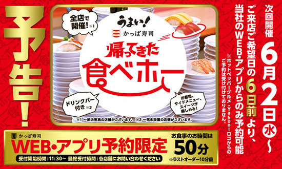 コロワイドグループのかっぱ寿司は6月2~13日の12日間の期間限定で、かっぱ寿司全店で食べ放題の「食べホー」を実施する。利用料金は、一般が2200円、シニア(65歳以上)が1700円、小学生が1200円、4~6歳が500円、3歳以下が無料(保護者1人につき2人まで。3人以降は1人につき500円)。延長料金が550円/1人30分となる。5月27日から予約を受け付ける。