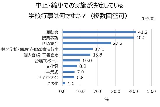 すでに中止または縮小開催が決まっている、21年の学校行事としては、「運動会」(41.2%)や「授業参観」(40.2%)を挙げる回答が多かった。