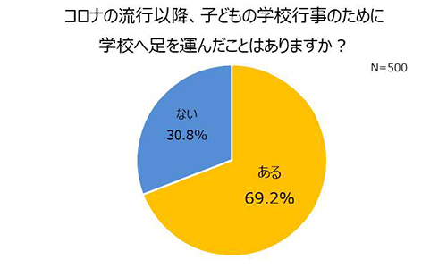 新型コロナの流行以降、子どもの学校行事のために学校へ行ったことがあるかを尋ねたところ、約3割が「ない」と答えている。