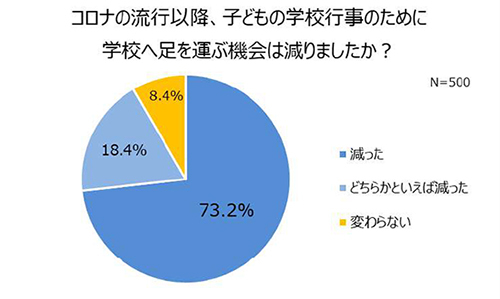 これまでと比較して、子どもの学校行事のために学校へ行く機会が減ったかを尋ねた質問では、「減った」「どちらかといえば減った」を合わせた割合が9割超に達した。